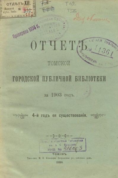 И вот наша библиотека досуществовала до 1865 года. Занимался делами библиотеки Дмитрий Львович Кузнецов. Он был выпускником Казанского университета и преподавателем нашей гимназии. И он еще в «Томских губернских ведомостях» вел целый большой отдел. И он же был и библиотекарем нашей библиотеки. По его инициативе губернскую библиотеку соединили с библиотекой гимназии. Вокруг библиотеки крутилась вся жизнь. Кузнецов позвал друга – Потанина сюда же, в Томск. Потанин приехал. Не знаю, Ядринцев был с ними или нет, но во всяком случае они и его в Томск звали. Тогда в воздухе носилась идея, что Сибирь – это место особенное, ему нужен университет, развитие, просвещение, а царское правительство как-то сдерживает развитие нашего края. И вот это движение сибирского областничества было объявлено сепаратистским. Потанин был отправлен на каторгу, Дмитрий Львович Кузнецов тоже был увезен из Томска. Библиотеку закрыли. Фонд ее передали, по одним сведениям, в реальное училище, по другим сведениям – в гимназию мужскую. Вроде как история на этом в 1865-м году должна была бы прекратиться. Но нет. Каждый год городская дума 200 рублей бюджета на счет библиотеки перечисляла. Она закрыта, а все равно – 200 рублей. В 1871-м году появилась частная макушинская библиотека. Она платная, дорогая – не все могут ходить к Макушину книжки читать, тем более на дом брать. Ну, кто-то мог, кто-то не мог. А где читать человеку, у которого средний достаток? «Давайте-ка, городские власти, открывайте городскую публичную библиотеку, хватит уже тянуть, деньги-то там лежат». И вот тогда в 1899-м году (как раз это тоже год, связанный с Пушкиным, столетие которого отмечала тогда Россия) открылась наша городская публичная библиотека. Если почитать ее отчеты, то тут любопытные вещи. Например, дается перечень самых читаемых авторов. И на первом месте – Антон Павлович Чехов в 1901 году, 441 книговыдача. Дальше идет Лейкин, Потапенко, Писемский, Майн Рид, на шестом месте Лев Николаевич Толстой. Здесь же рассказывается, какие социальные слои в библиотеку входят: чиновников 124, инженеров 6, врачей 33, преподавателей 68 и так дальше.